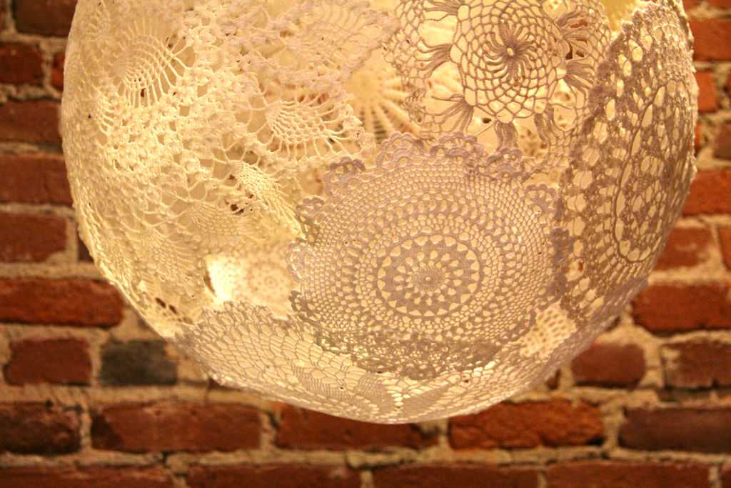 Подобные вещицы стали популярны несколько лет назад. Легкие и невесомые шары из ниток, в зависимости от диаметра, могут стать либо елочной игрушкой, либо предметом декора, либо абажуром. Нитки можно использовать любого цвета, а можно покрасить их, когда поделка будет готова. Сверху также можно декорировать лентами и кружевом, бусинами или пуговицами — так поделка будет выглядеть изящнее.