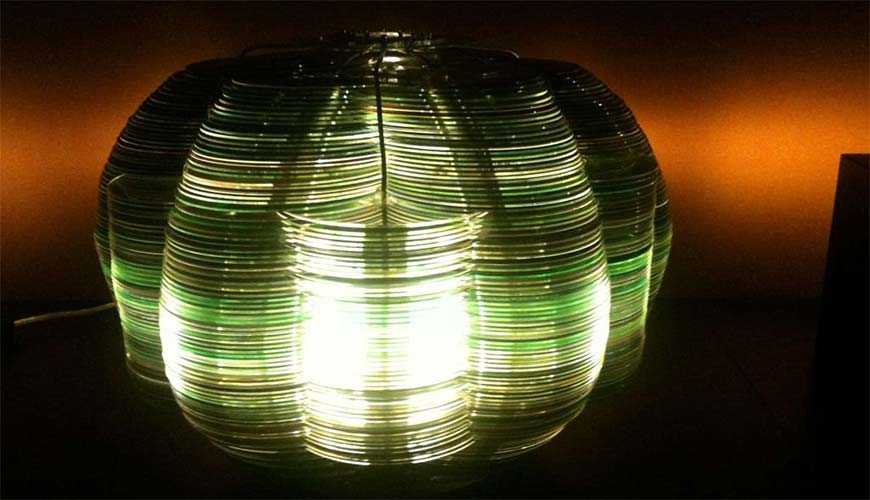 Чтобы не поранить руки, острые края шлифуют. Провод пропускают через горловину, подсоединяют патрон. Светильник, сделанный своими руками, крепят к каркасу. В зависимости от пожеланий мастера оригинальных плафонов к ободу можно прикрепить три-четыре. Благодаря мастер-классу по декорированию самодельных люстр создают различные украшения из бумаги, пластика и дерева.