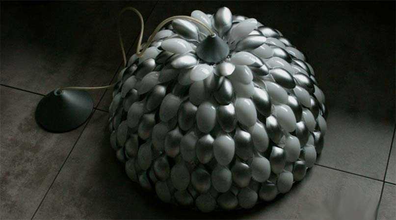 Обрезать донышко бутылки, тщательно просушить емкость. Держатели ложек обрезаются, их длина должна быть 2-3 сантиметра. Нанести клей на держатели и приклеить к поверхности бутылки. Приклеивать необходимо аккуратно, стараться не оставлять пустых мест. Каждый верхний ряд ложек наклеивается между ложками нижнего ряда сверху. Таким образом, оклеивается внешняя поверхность бутылки. В середине бутылки крепится электропатрон. Люстра подключается к домашней электросети, закрепляется на отведенном месте.