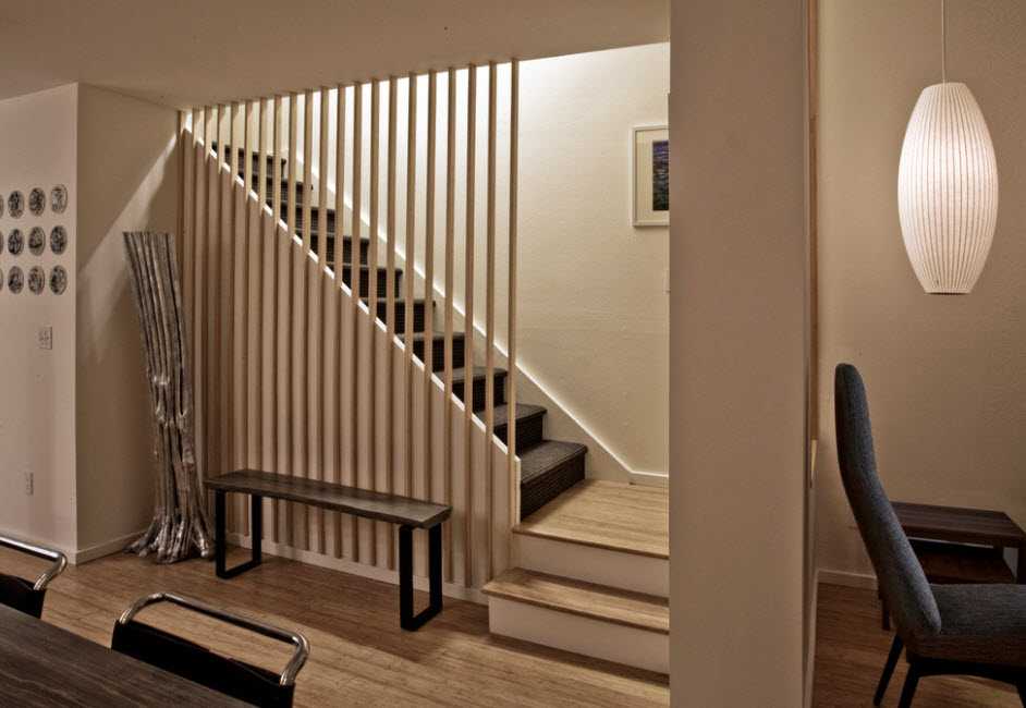 Правильное расположение светильников не искажает контуры ступеней и позволяет избегать затененных участков, в результате человек без риска может подняться на второй этаж или спуститься с него. Подсветка пролета осуществляется с помощью светодиодных, неоновых и галогеновых светильников. Использование конкретного оборудования зависит от материала и конфигурации лестничного марша.