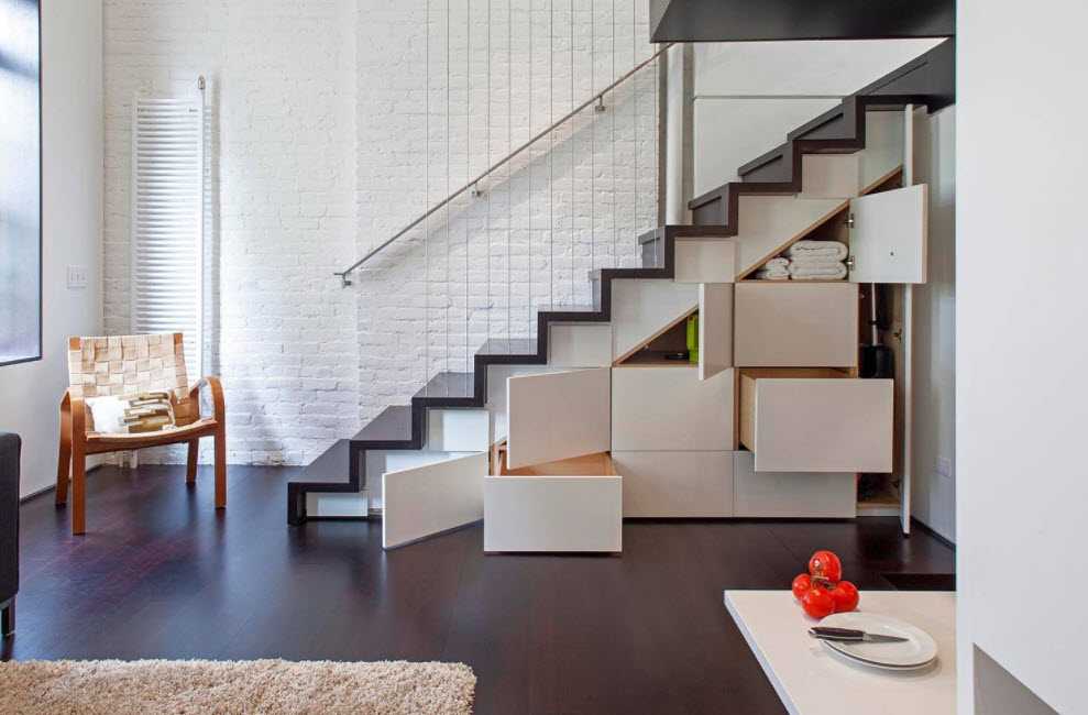 Участок под лестницей используют для содержания вещей и предметов. Удобство и практичность зоны зависит от размеров области и назначения. Встроенная система с выдвижными полками и штангами станет вместительным гардеробом. В шкафу можно хранить одежду и обувь до следующего сезона.