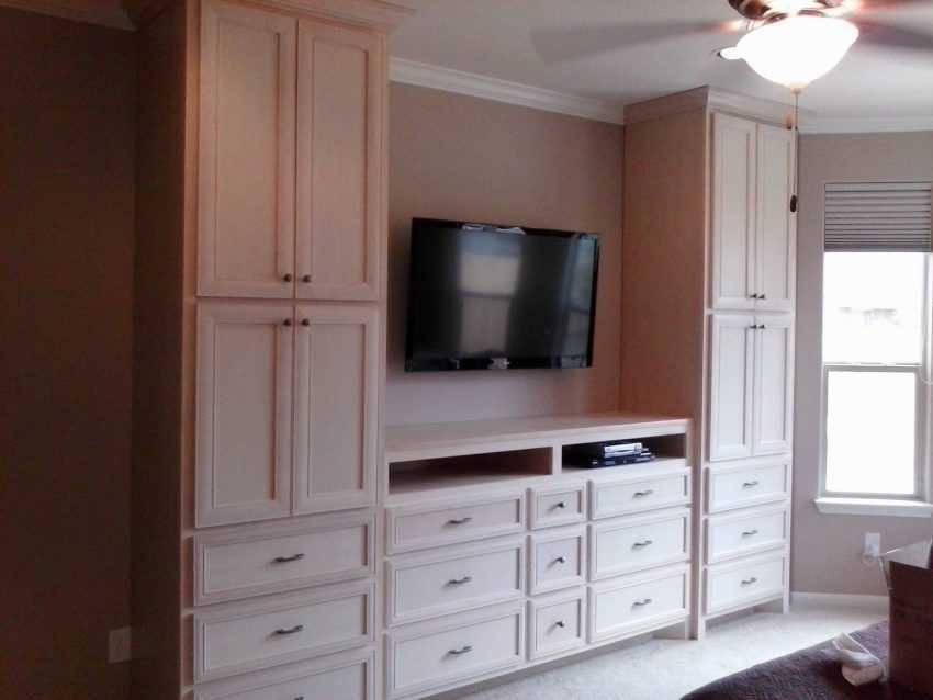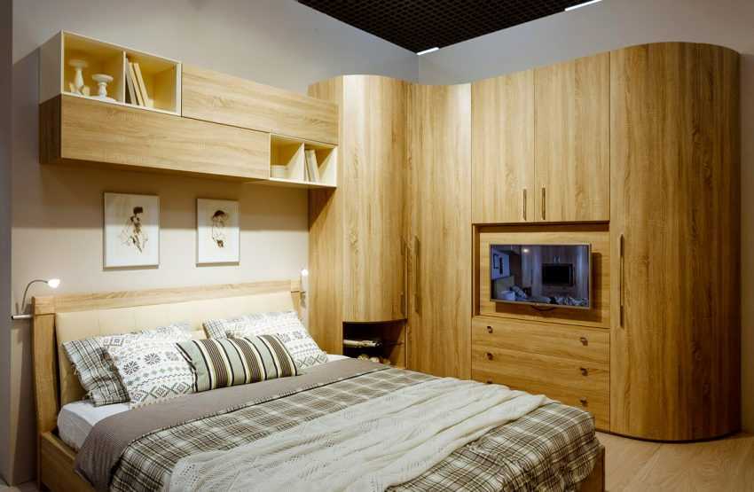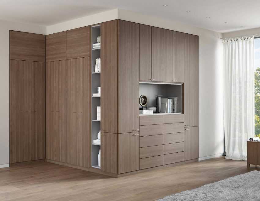 Шкафы-купе и угловые конструкции для хранения идеальны в маленьких спальнях. Встроенные шифоньеры отличаются от стандартных тем, что имеют всего лишь каркас и фасад с раздвижными дверцами. Поскольку простираются до потолка и устанавливаются прямо на пол или подготовленную ровную поверхность, некоторые детали делать не имеет смысла.