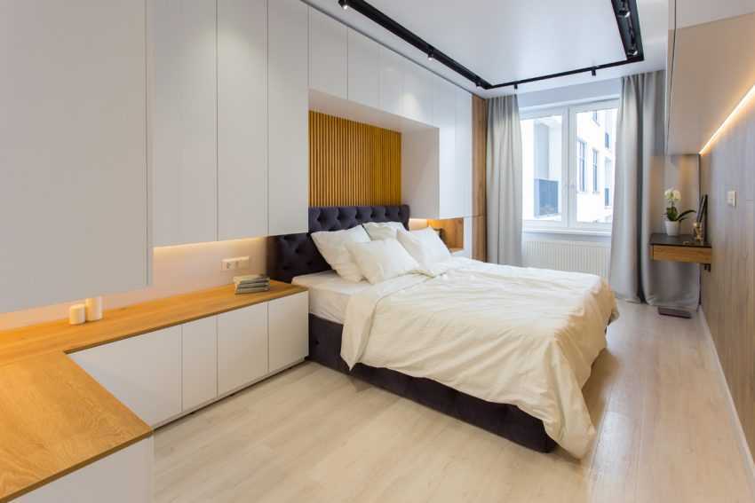 Меблируя спальную комнату, стоит отказаться от размещения предметов чётко по периметру, если не хотите, чтобы она была похожа на короб. Кровать рекомендуется установить изголовьем к стене, не имеющей проёмов, на расстоянии минимум в 70 см от трёх других стен. Предпочтительно, чтобы ложе занимало центральную часть помещения.