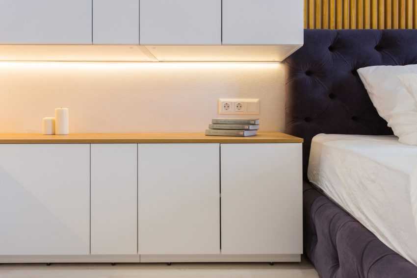Прикроватные тумбочки не должны находиться впритык к спальному месту – между ними следует оставить 10 – 15 см.