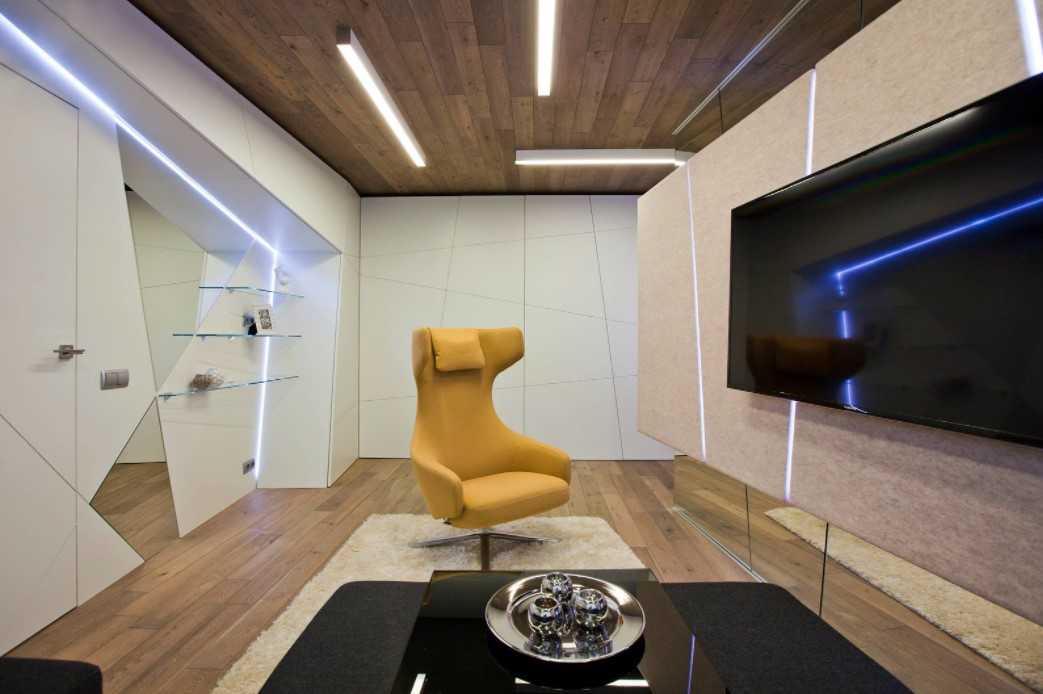 Интерьере в стиле Хай-тек в большем преимуществе, зачастую оформляют стены в белый цвет. Поэтому тут только серебристые и черные цвета корпуса телевизора. Молочный цвет уже смотреться не будет. Есть вариант с использованием белого цвета корпуса на белоснежной стене. В таком случае можно использовать неоновую подсветку за корпусом телевизора, чтобы придать, как можно больше стилистики и выделить зону-тв в интерьере.