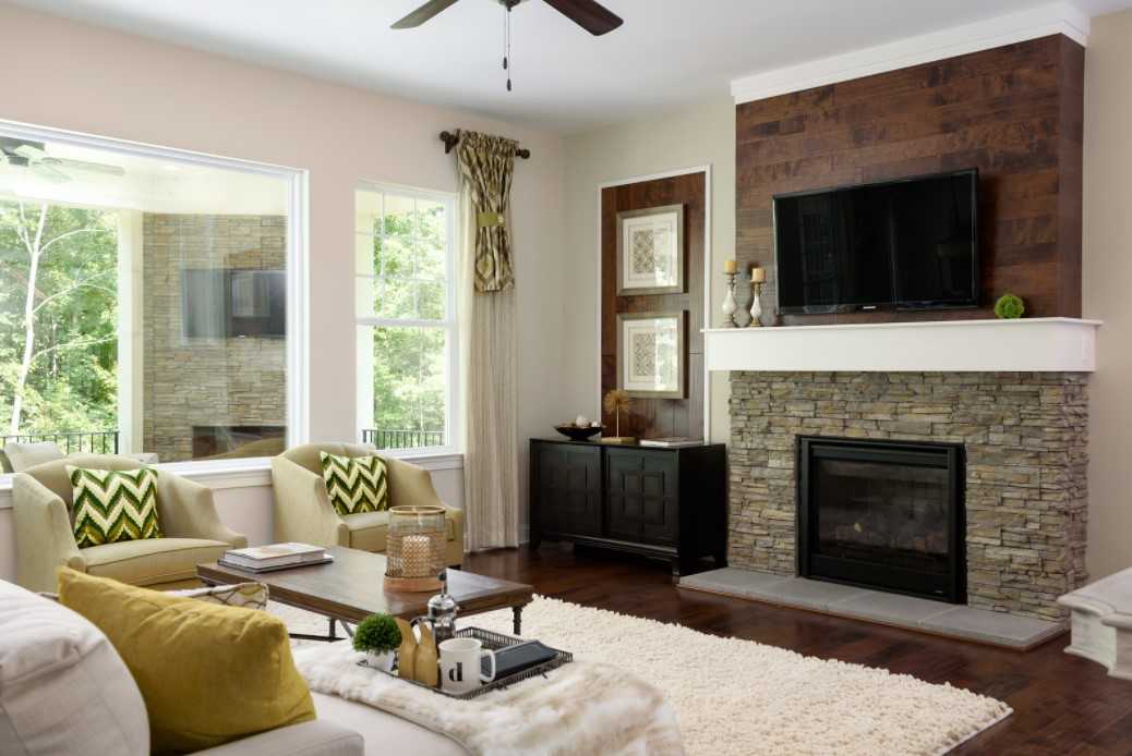 В помещении с камином лучше выбрать вариант размещения телевизора и камина на разных стенах, в этом случае ни один из предметов не будет «обделён вниманием». Такое расположение позволяет выделить каждый предмет