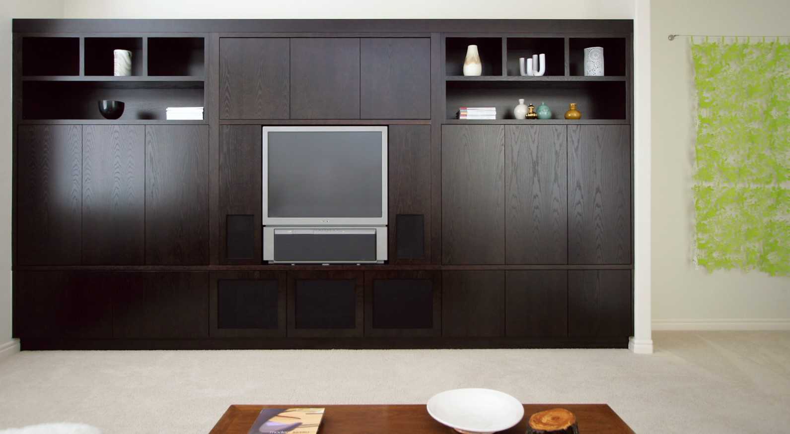 Наиболее традиционным является расположение предметов вдоль стены. Для комфортного просмотра любимых передач напротив устанавливается мягкая мебель. Угловые стенки не только красиво смотрятся, но и позволяют комфортно смотреть ТВ из любой точки комнаты.