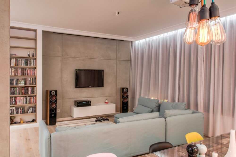 Стиль схожий с современным. Он приветствует любой вид подчеркивания наличия телевизора. Идеально поставить его на объемный деревянный комод или обыграть бетонной суровой подставкой, поместить в кирпичную нишу.